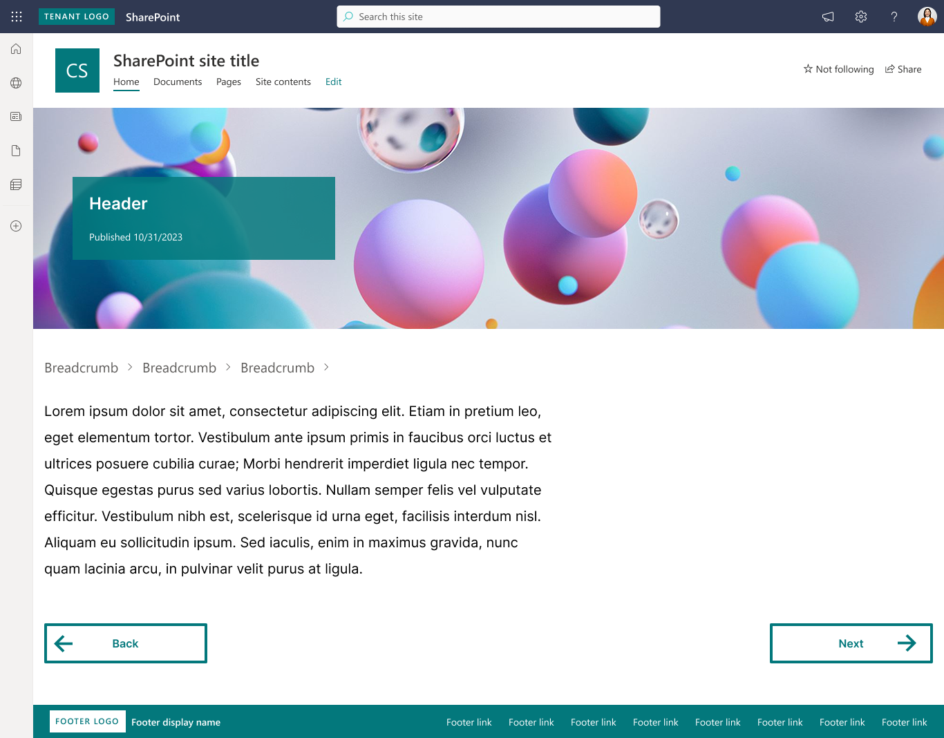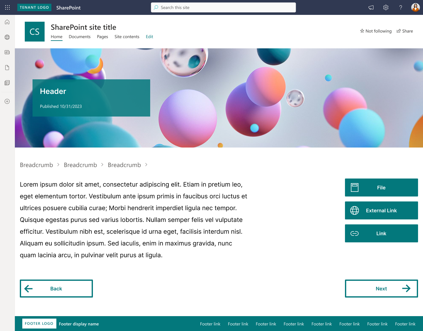 Sequential items are pages that put the user on rails to follow a specific path. The only interactives here are the "Back" and "Next" buttons which use a different styling from the Related Links buttons.