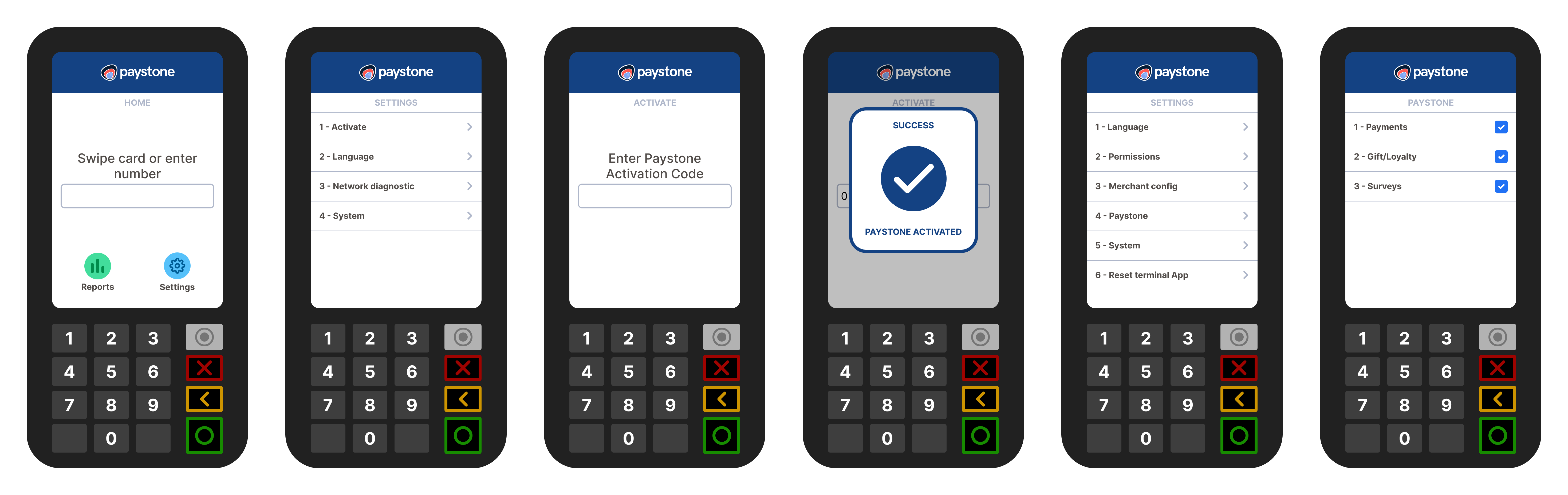 My research had me look at the current onboarding flows for our terminals. The existing onboarding flow for the user was disconnected from their back office account. The idea behind this direction was to allow them to set up their terminals as quickly as possible, and was partly due to the fractured nature of their two product offerings. Currently, products were activated were through separate long activation keys the user had to punch in manually for each product they paid for. Existing user research showed that this process was arduous and frustrating, which led us to believe that adding in a third long activation code would be unlikely to improve the process.